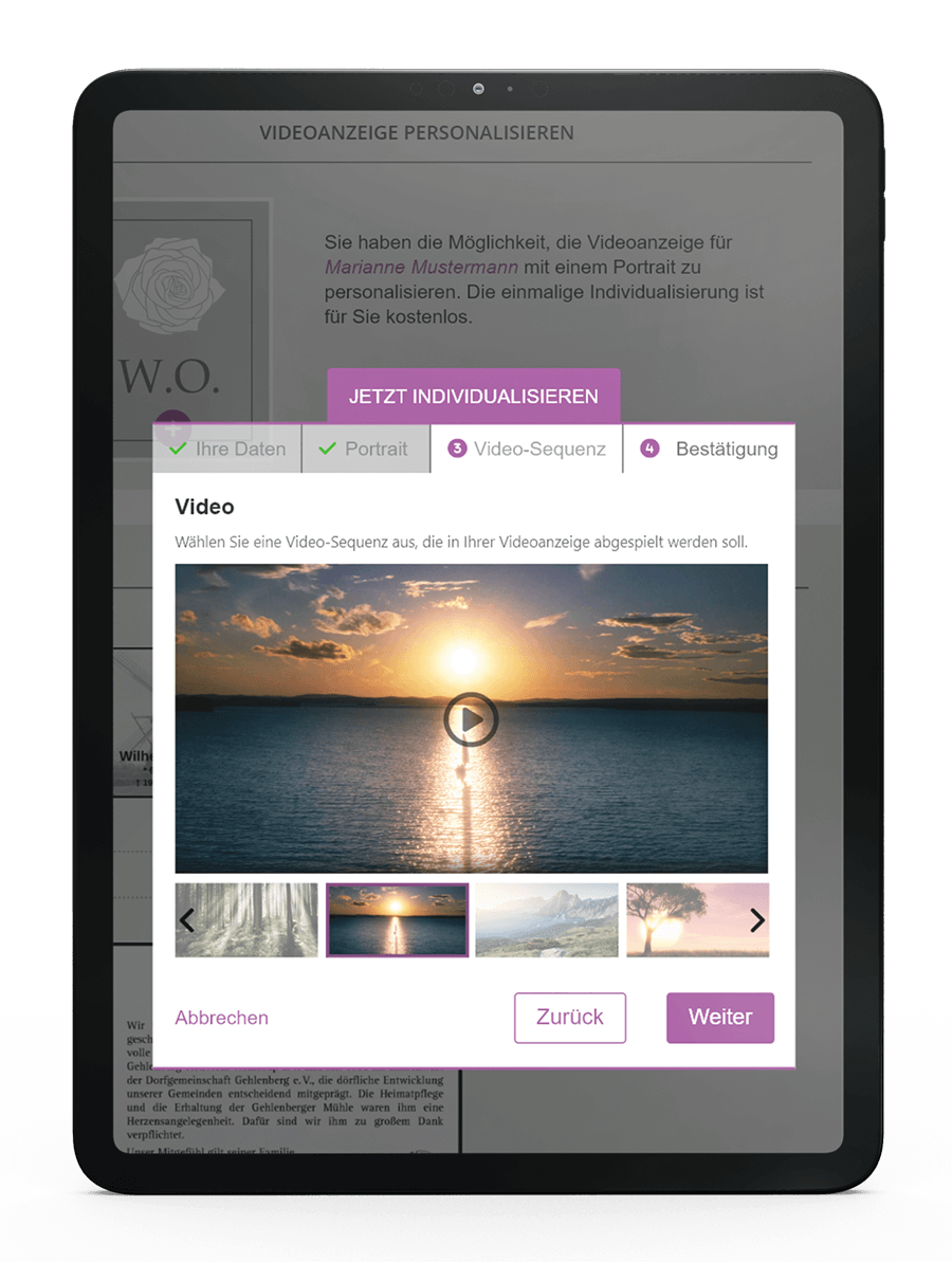 Ab sofort wird es zu jeder Traueranzeige ein persönliches Video geben. Die Trauer-Videoanzeige wird automatisch generiert, kann aber von Ihnen individuell angepasst werden. Laden Sie beispielsweise ein eigenes neues Profilfoto hoch und suchen Sie sich eine der acht verschiedenen Videovorlagen aus.