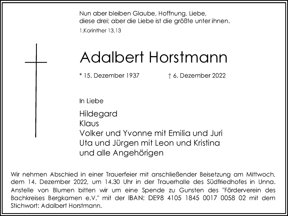 Hier finden Sie alle Traueranzeigen aus der Zeitung, die bisher für Adalbert Horstmann erschienen sind. Weitere Traueranzeigen, die in der Zeitung erscheinen, werden hier ebenfalls aufgelistet