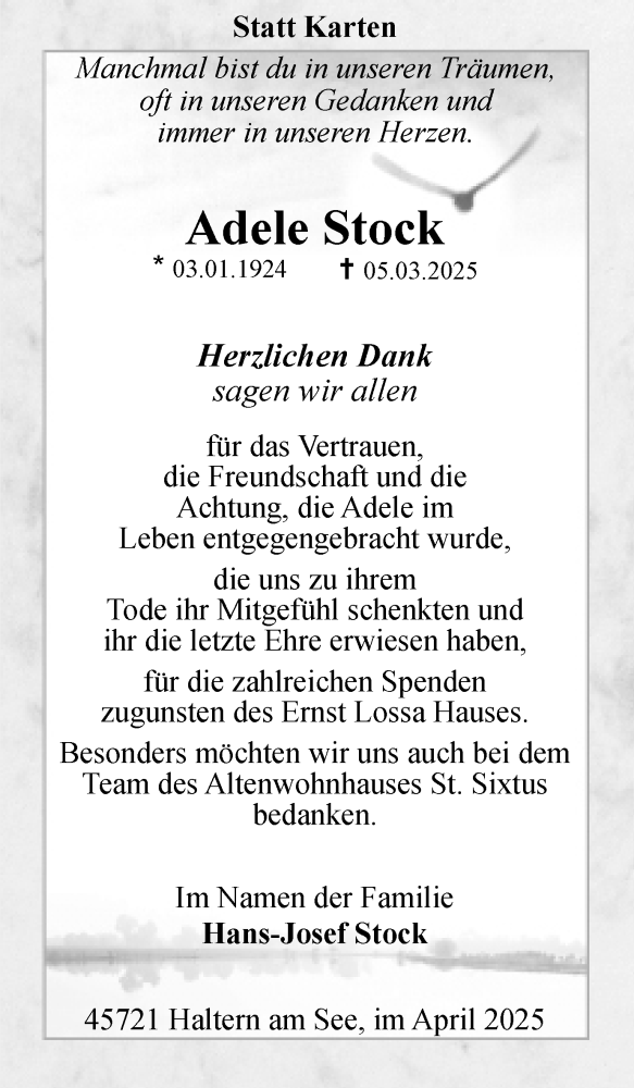 Hier finden Sie alle Traueranzeigen aus der Zeitung, die bisher für Adele Stock erschienen sind. Weitere Traueranzeigen, die in der Zeitung erscheinen, werden hier ebenfalls aufgelistet