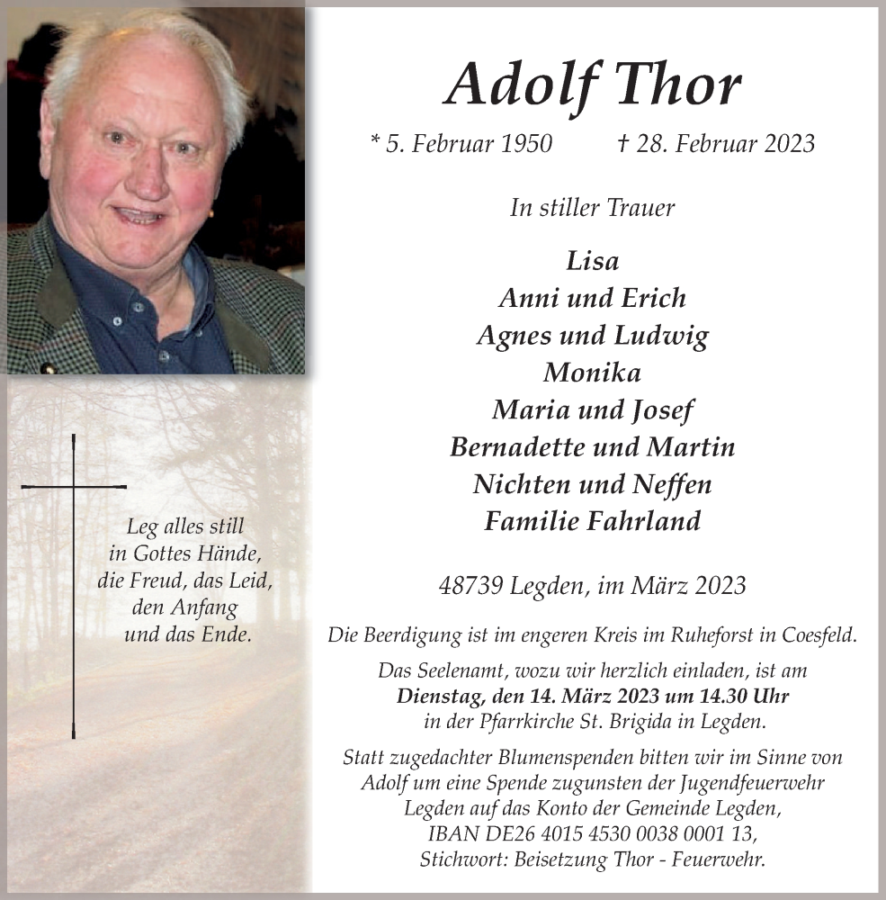 Hier finden Sie alle Traueranzeigen aus der Zeitung, die bisher für Adolf Thor erschienen sind. Weitere Traueranzeigen, die in der Zeitung erscheinen, werden hier ebenfalls aufgelistet
