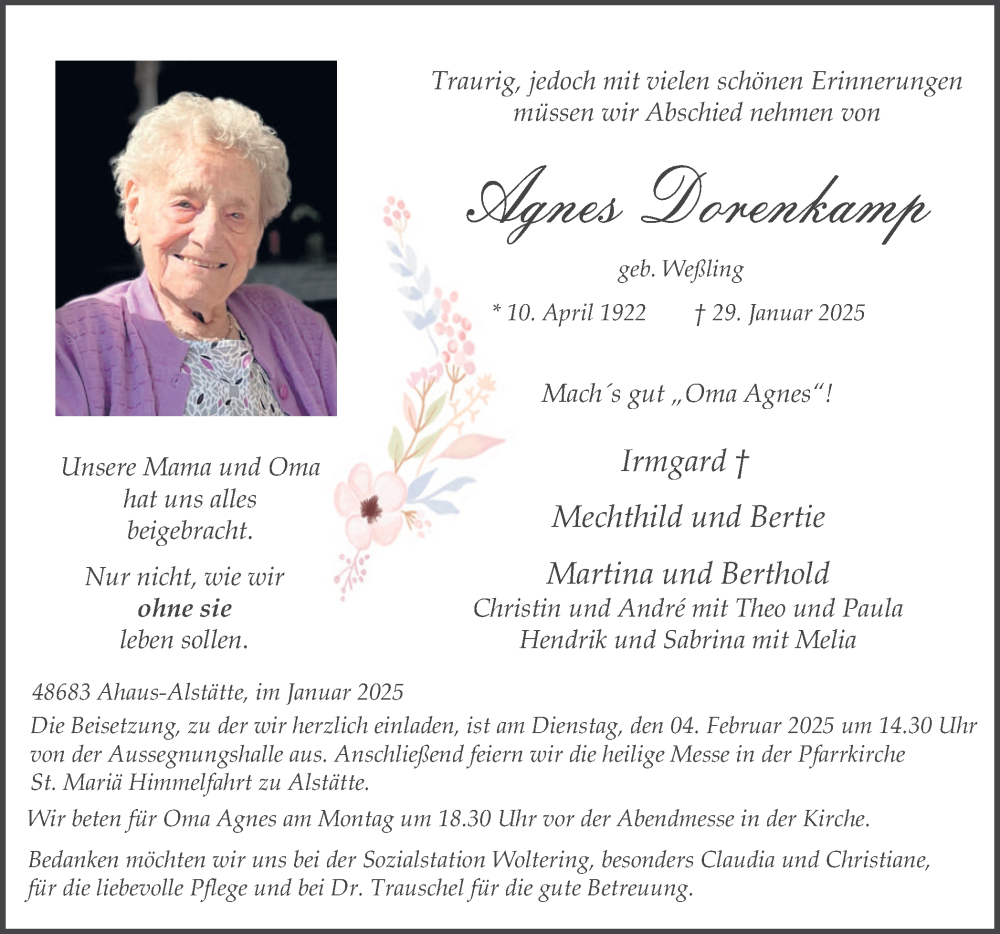 Hier finden Sie alle Traueranzeigen aus der Zeitung, die bisher für Agnes Dorenkamp erschienen sind. Weitere Traueranzeigen, die in der Zeitung erscheinen, werden hier ebenfalls aufgelistet