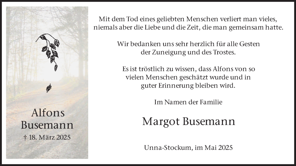 Hier finden Sie alle Traueranzeigen aus der Zeitung, die bisher für Alfons Busemann erschienen sind. Weitere Traueranzeigen, die in der Zeitung erscheinen, werden hier ebenfalls aufgelistet