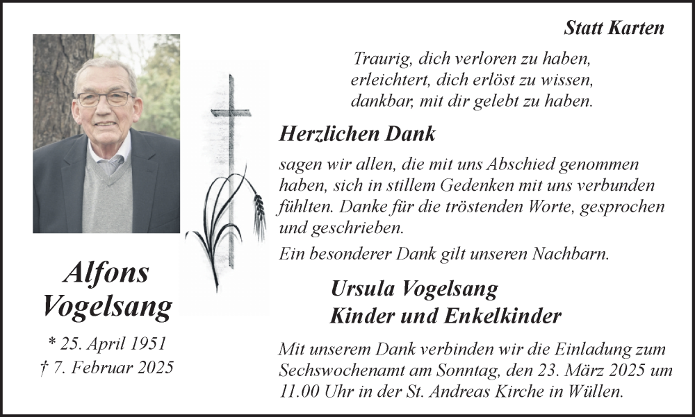 Hier finden Sie alle Traueranzeigen aus der Zeitung, die bisher für Alfons Vogelsang erschienen sind. Weitere Traueranzeigen, die in der Zeitung erscheinen, werden hier ebenfalls aufgelistet