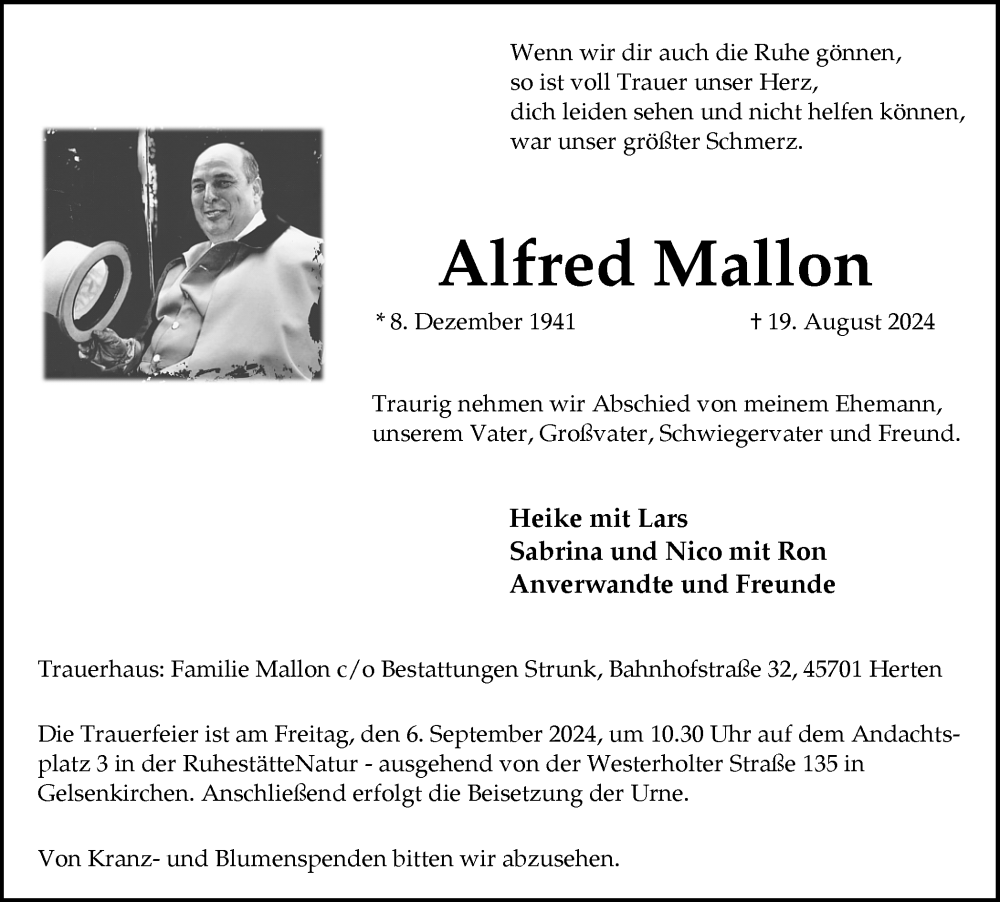 Hier finden Sie alle Traueranzeigen aus der Zeitung, die bisher für Alfred Mallon erschienen sind. Weitere Traueranzeigen, die in der Zeitung erscheinen, werden hier ebenfalls aufgelistet