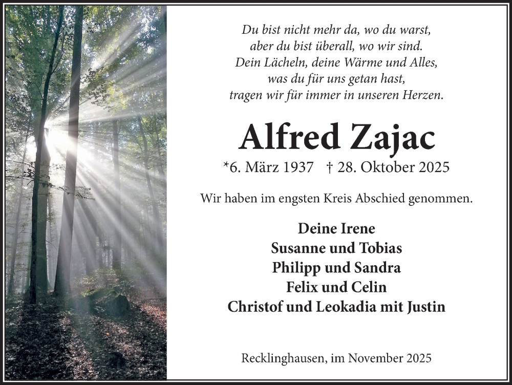 Hier finden Sie alle Traueranzeigen aus der Zeitung, die bisher für Alfred Zajac erschienen sind. Weitere Traueranzeigen, die in der Zeitung erscheinen, werden hier ebenfalls aufgelistet