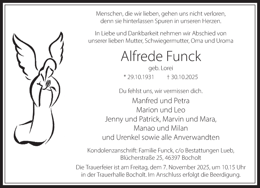 Hier finden Sie alle Traueranzeigen aus der Zeitung, die bisher für Alfrede Funck erschienen sind. Weitere Traueranzeigen, die in der Zeitung erscheinen, werden hier ebenfalls aufgelistet
