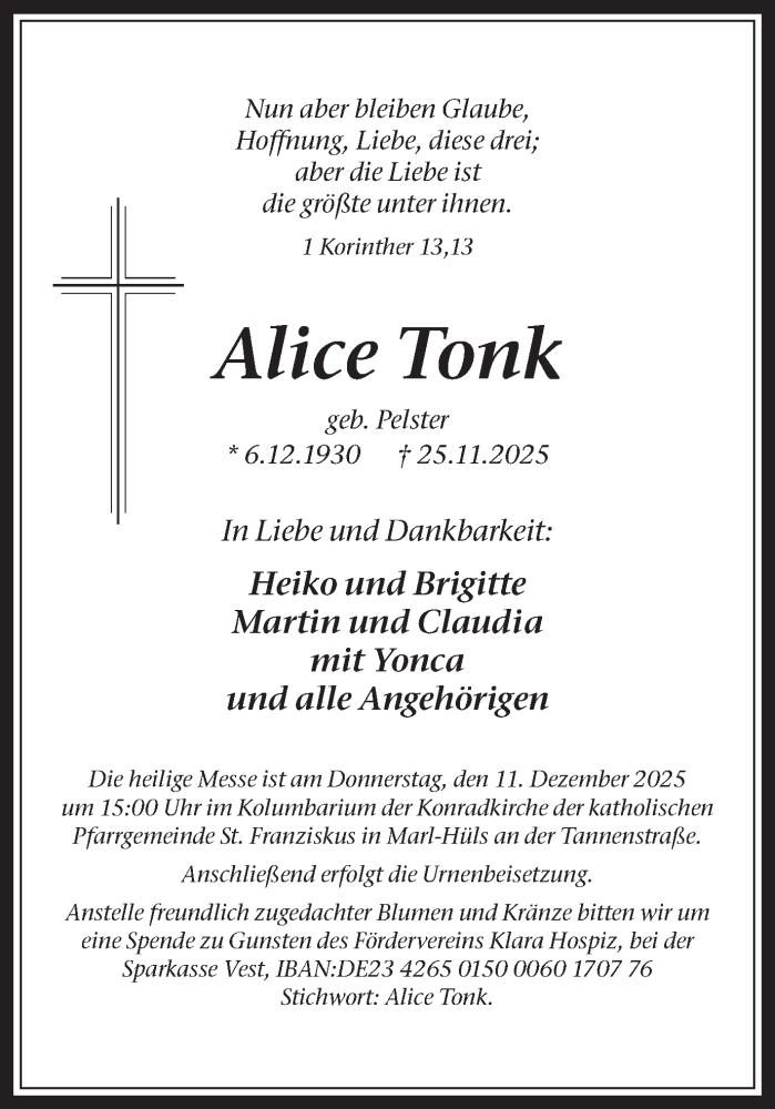 Hier finden Sie alle Traueranzeigen aus der Zeitung, die bisher für Alice Tonk erschienen sind. Weitere Traueranzeigen, die in der Zeitung erscheinen, werden hier ebenfalls aufgelistet