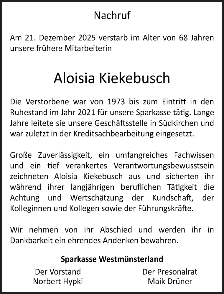 Hier finden Sie alle Traueranzeigen aus der Zeitung, die bisher für Aloisia Kiekebusch erschienen sind. Weitere Traueranzeigen, die in der Zeitung erscheinen, werden hier ebenfalls aufgelistet