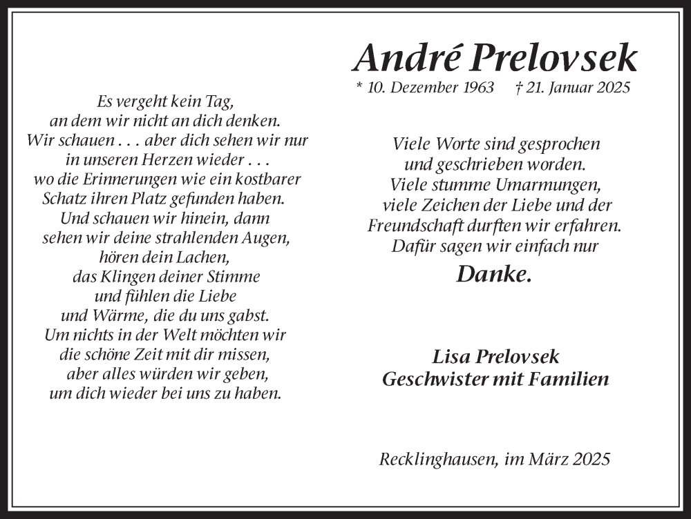 Hier finden Sie alle Traueranzeigen aus der Zeitung, die bisher für Andre Prelovsek erschienen sind. Weitere Traueranzeigen, die in der Zeitung erscheinen, werden hier ebenfalls aufgelistet