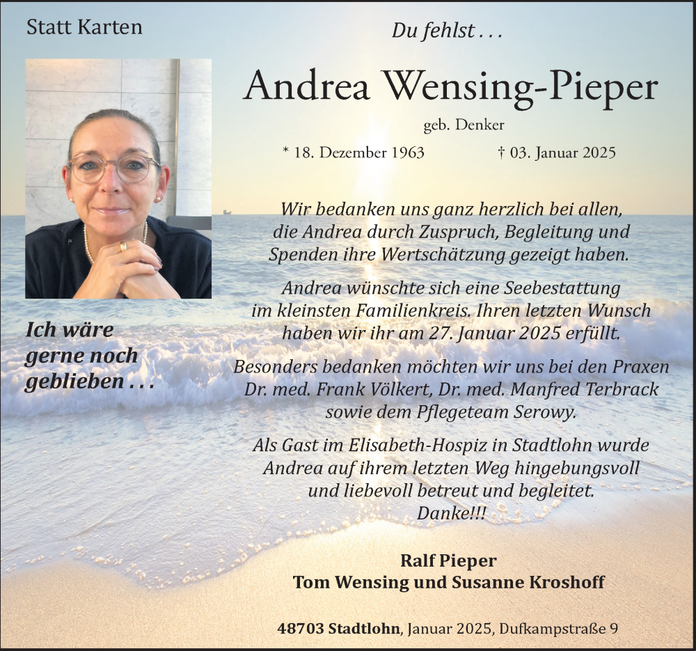 Hier finden Sie alle Traueranzeigen aus der Zeitung, die bisher für Andrea Wensing-Pieper erschienen sind. Weitere Traueranzeigen, die in der Zeitung erscheinen, werden hier ebenfalls aufgelistet
