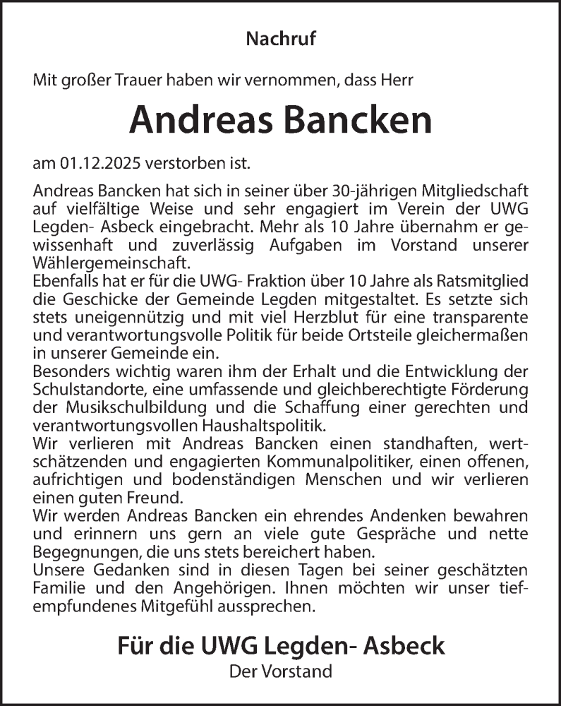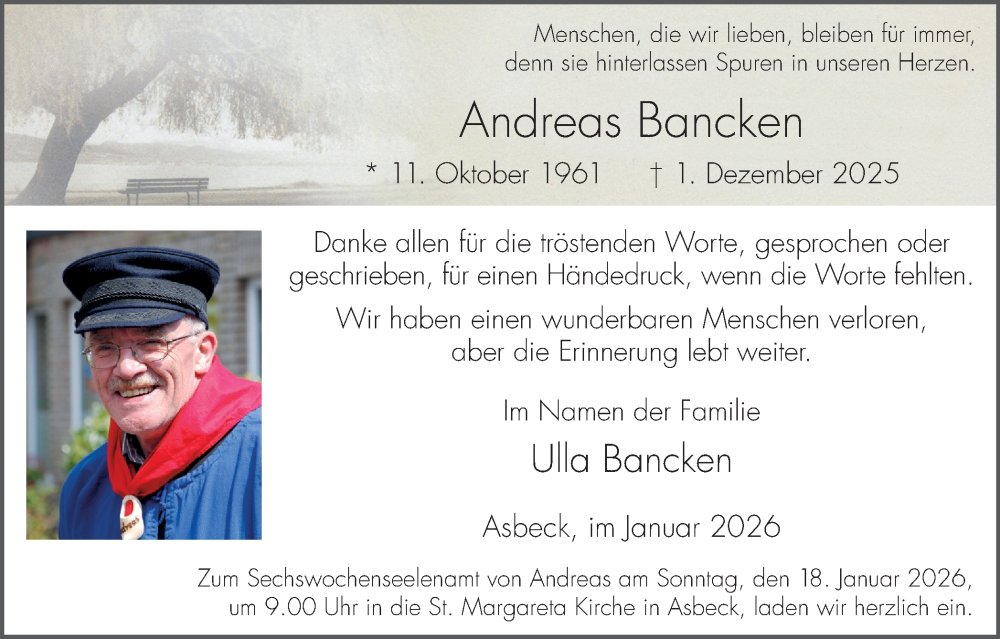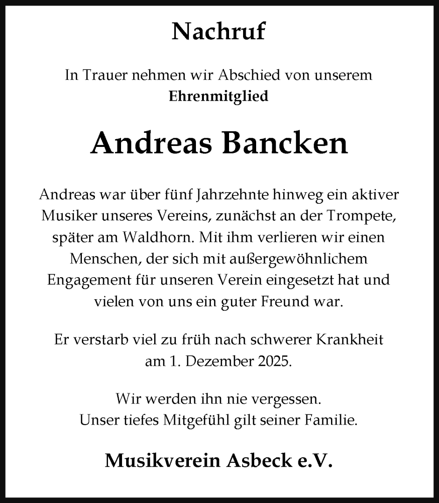 Hier finden Sie alle Traueranzeigen aus der Zeitung, die bisher für Andreas Bancken erschienen sind. Weitere Traueranzeigen, die in der Zeitung erscheinen, werden hier ebenfalls aufgelistet