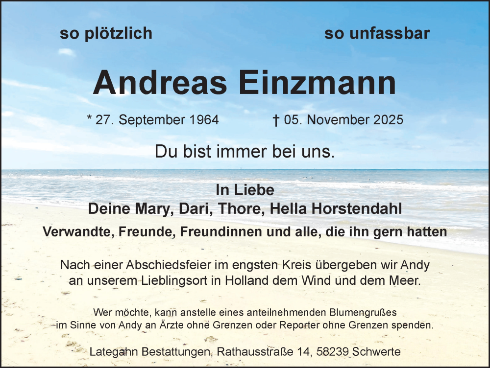 Hier finden Sie alle Traueranzeigen aus der Zeitung, die bisher für Andreas Einzmann erschienen sind. Weitere Traueranzeigen, die in der Zeitung erscheinen, werden hier ebenfalls aufgelistet