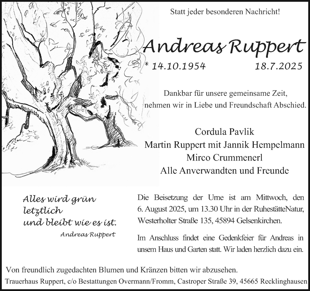Hier finden Sie alle Traueranzeigen aus der Zeitung, die bisher für Andreas Ruppert erschienen sind. Weitere Traueranzeigen, die in der Zeitung erscheinen, werden hier ebenfalls aufgelistet