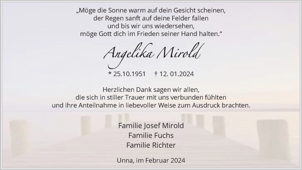 Hier finden Sie alle Traueranzeigen aus der Zeitung, die bisher für Angelika Mirold erschienen sind. Weitere Traueranzeigen, die in der Zeitung erscheinen, werden hier ebenfalls aufgelistet
