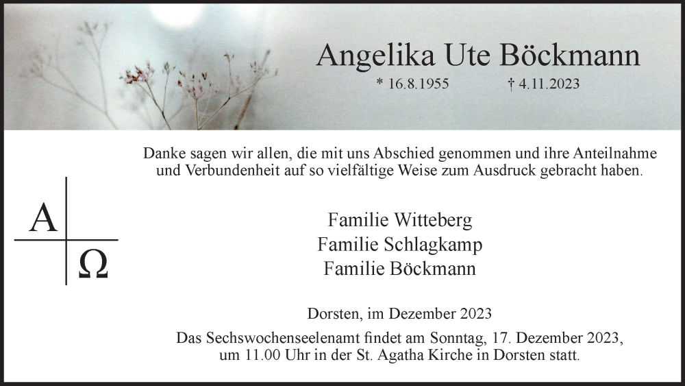 Hier finden Sie alle Traueranzeigen aus der Zeitung, die bisher für Angelika Ute Böckmann erschienen sind. Weitere Traueranzeigen, die in der Zeitung erscheinen, werden hier ebenfalls aufgelistet