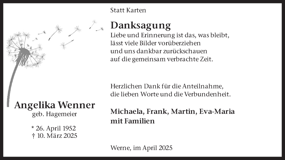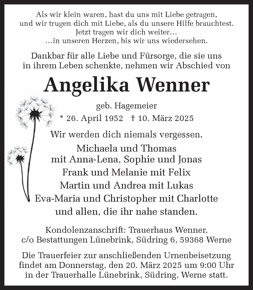 Hier finden Sie alle Traueranzeigen aus der Zeitung, die bisher für Angelika Wenner erschienen sind. Weitere Traueranzeigen, die in der Zeitung erscheinen, werden hier ebenfalls aufgelistet