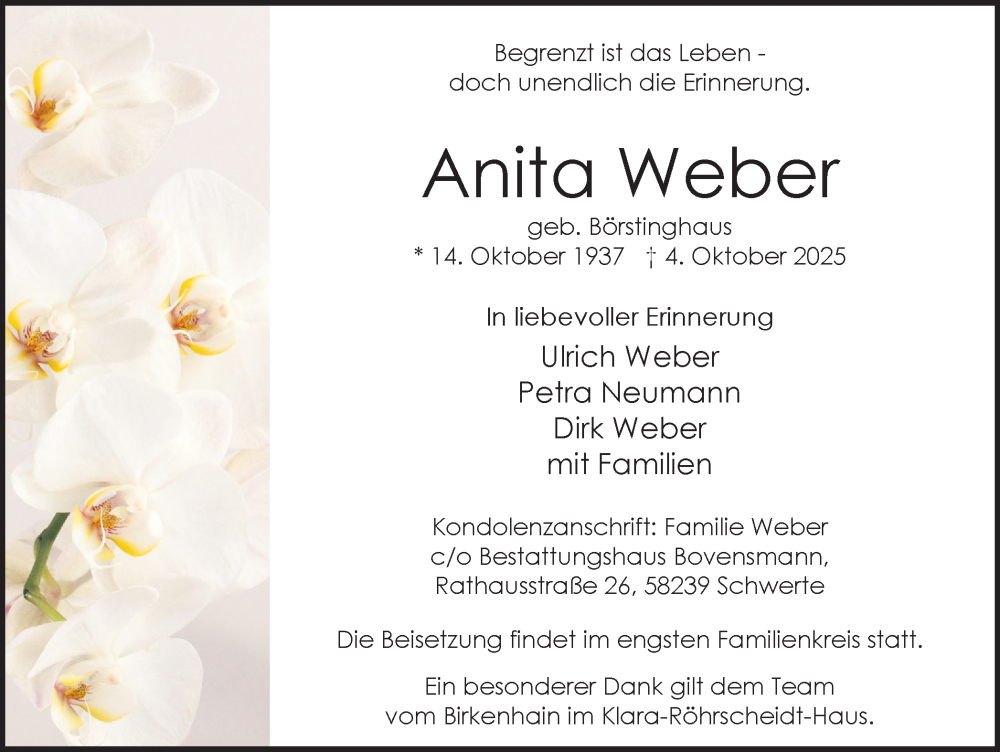 Hier finden Sie alle Traueranzeigen aus der Zeitung, die bisher für Anita Weber erschienen sind. Weitere Traueranzeigen, die in der Zeitung erscheinen, werden hier ebenfalls aufgelistet