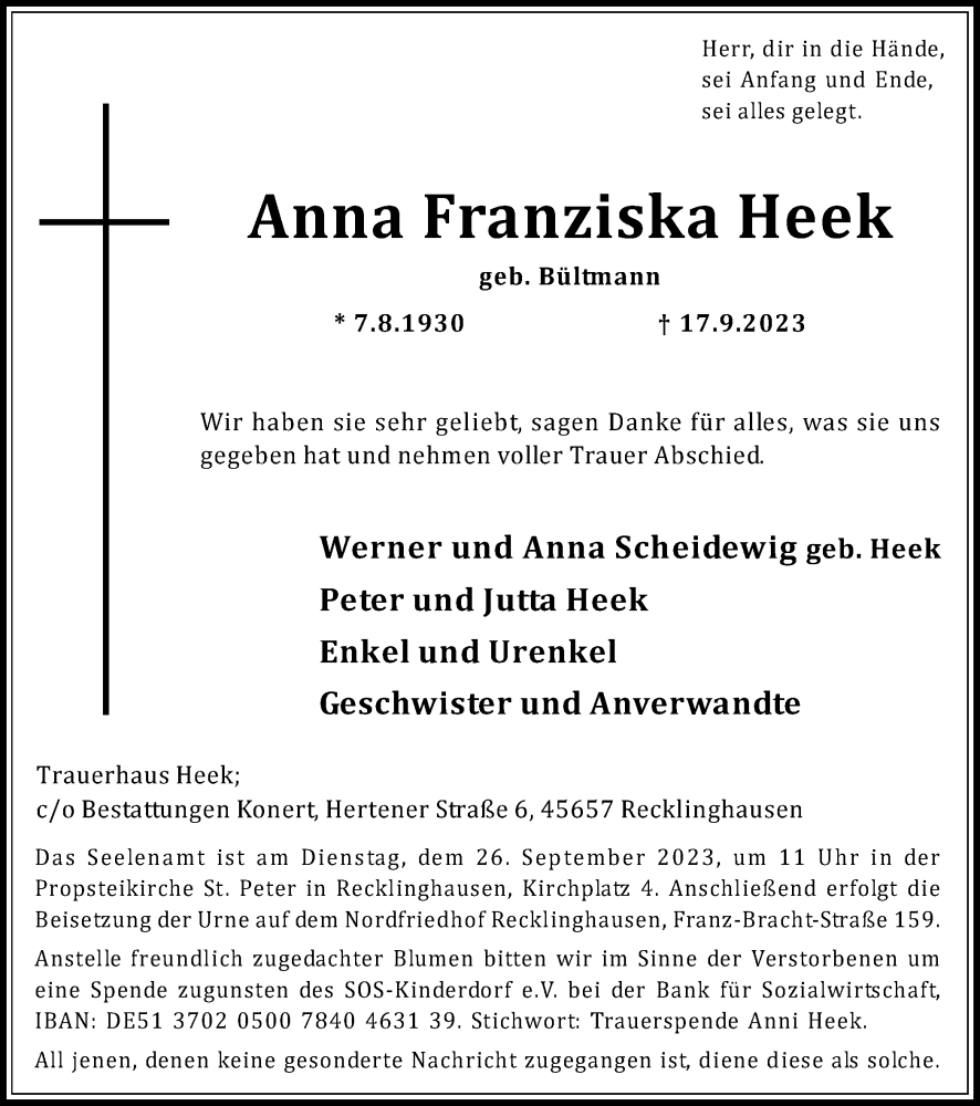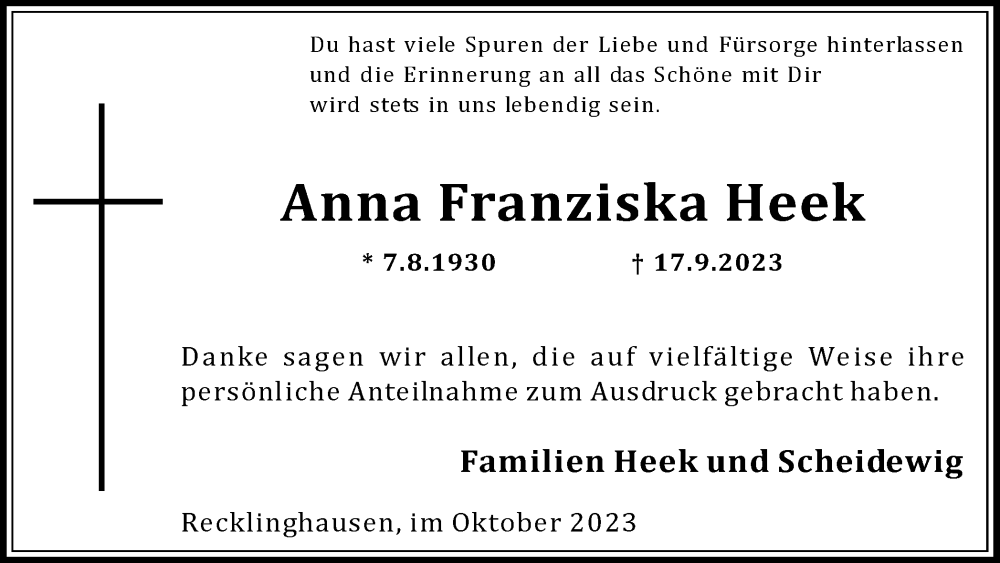 Hier finden Sie alle Traueranzeigen aus der Zeitung, die bisher für Anna Franziska Heek erschienen sind. Weitere Traueranzeigen, die in der Zeitung erscheinen, werden hier ebenfalls aufgelistet