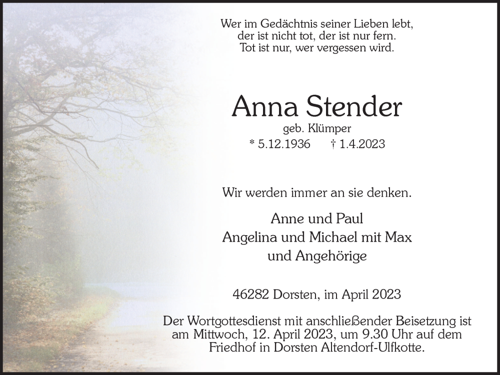 Hier finden Sie alle Traueranzeigen aus der Zeitung, die bisher für Anna Stender erschienen sind. Weitere Traueranzeigen, die in der Zeitung erscheinen, werden hier ebenfalls aufgelistet