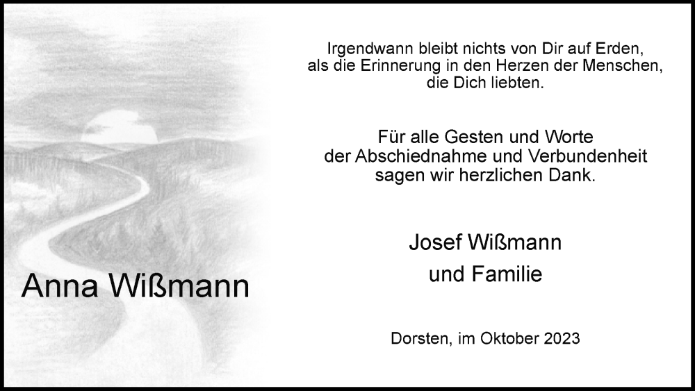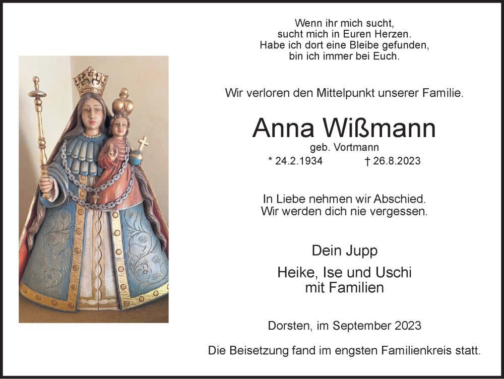 Hier finden Sie alle Traueranzeigen aus der Zeitung, die bisher für Anna Wißmann erschienen sind. Weitere Traueranzeigen, die in der Zeitung erscheinen, werden hier ebenfalls aufgelistet