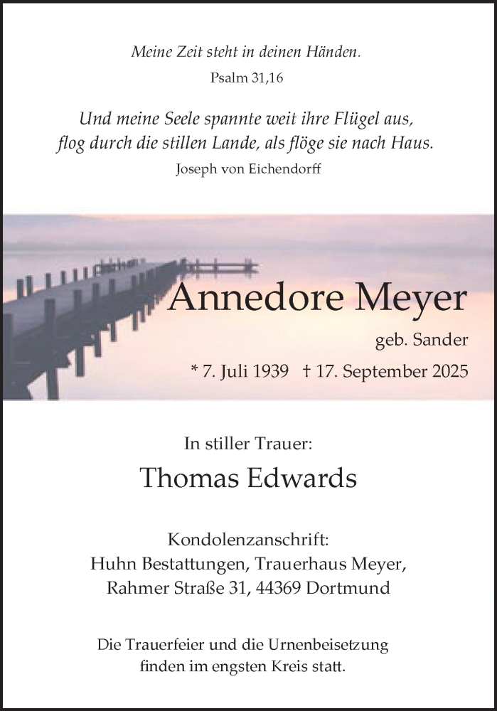 Hier finden Sie alle Traueranzeigen aus der Zeitung, die bisher für Annedore Meyer erschienen sind. Weitere Traueranzeigen, die in der Zeitung erscheinen, werden hier ebenfalls aufgelistet