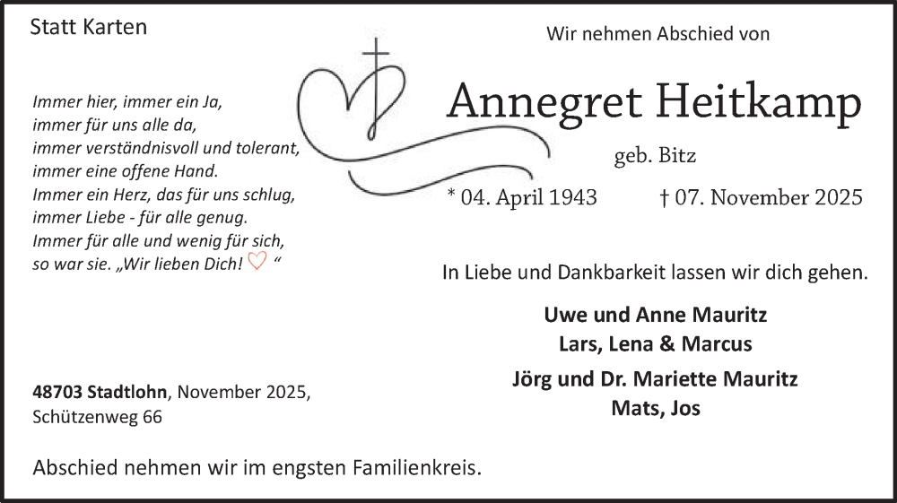 Hier finden Sie alle Traueranzeigen aus der Zeitung, die bisher für Annegret Heitkamp erschienen sind. Weitere Traueranzeigen, die in der Zeitung erscheinen, werden hier ebenfalls aufgelistet
