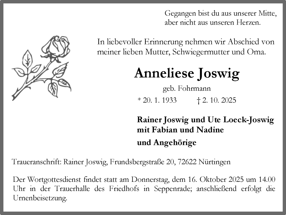 Hier finden Sie alle Traueranzeigen aus der Zeitung, die bisher für Anneliese Joswig erschienen sind. Weitere Traueranzeigen, die in der Zeitung erscheinen, werden hier ebenfalls aufgelistet