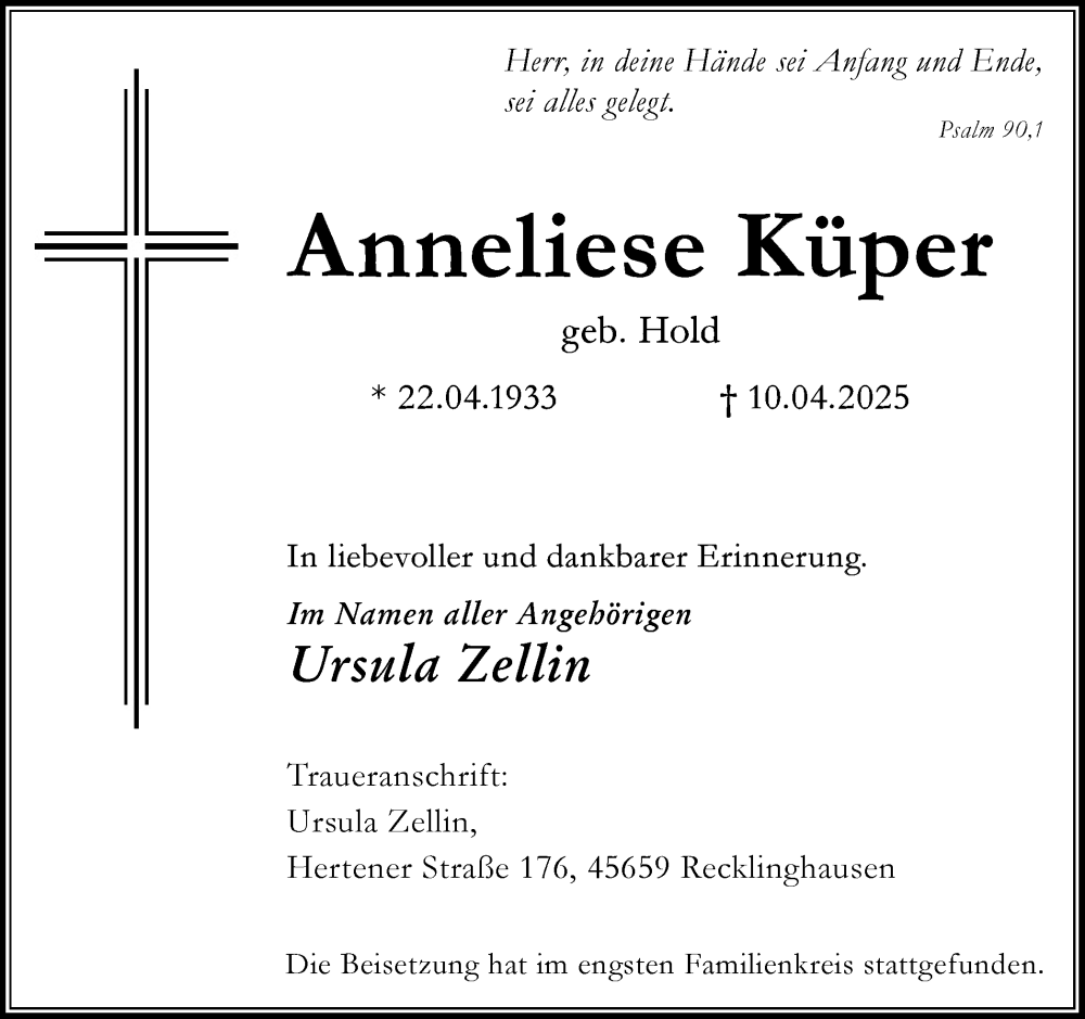 Hier finden Sie alle Traueranzeigen aus der Zeitung, die bisher für Anneliese Küper erschienen sind. Weitere Traueranzeigen, die in der Zeitung erscheinen, werden hier ebenfalls aufgelistet