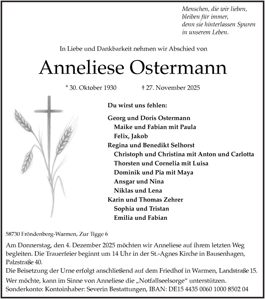 Hier finden Sie alle Traueranzeigen aus der Zeitung, die bisher für Anneliese Ostermann erschienen sind. Weitere Traueranzeigen, die in der Zeitung erscheinen, werden hier ebenfalls aufgelistet