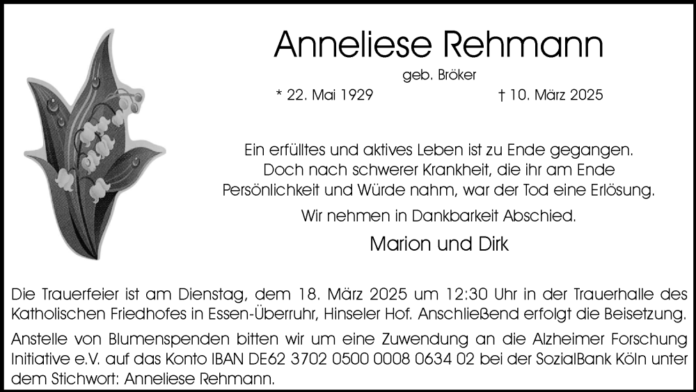 Hier finden Sie alle Traueranzeigen aus der Zeitung, die bisher für Anneliese Rehmann erschienen sind. Weitere Traueranzeigen, die in der Zeitung erscheinen, werden hier ebenfalls aufgelistet