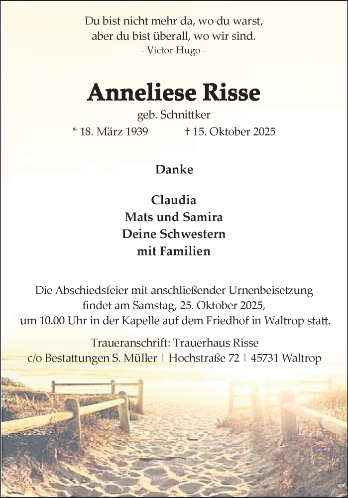 Hier finden Sie alle Traueranzeigen aus der Zeitung, die bisher für Anneliese Risse erschienen sind. Weitere Traueranzeigen, die in der Zeitung erscheinen, werden hier ebenfalls aufgelistet