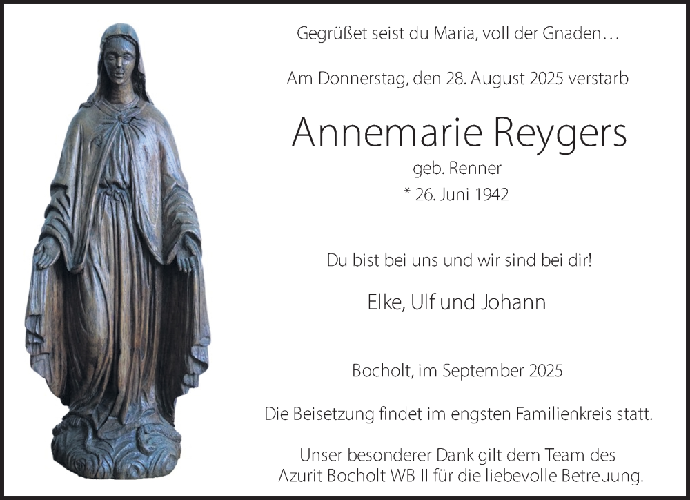 Hier finden Sie alle Traueranzeigen aus der Zeitung, die bisher für Annemarie Reygers erschienen sind. Weitere Traueranzeigen, die in der Zeitung erscheinen, werden hier ebenfalls aufgelistet
