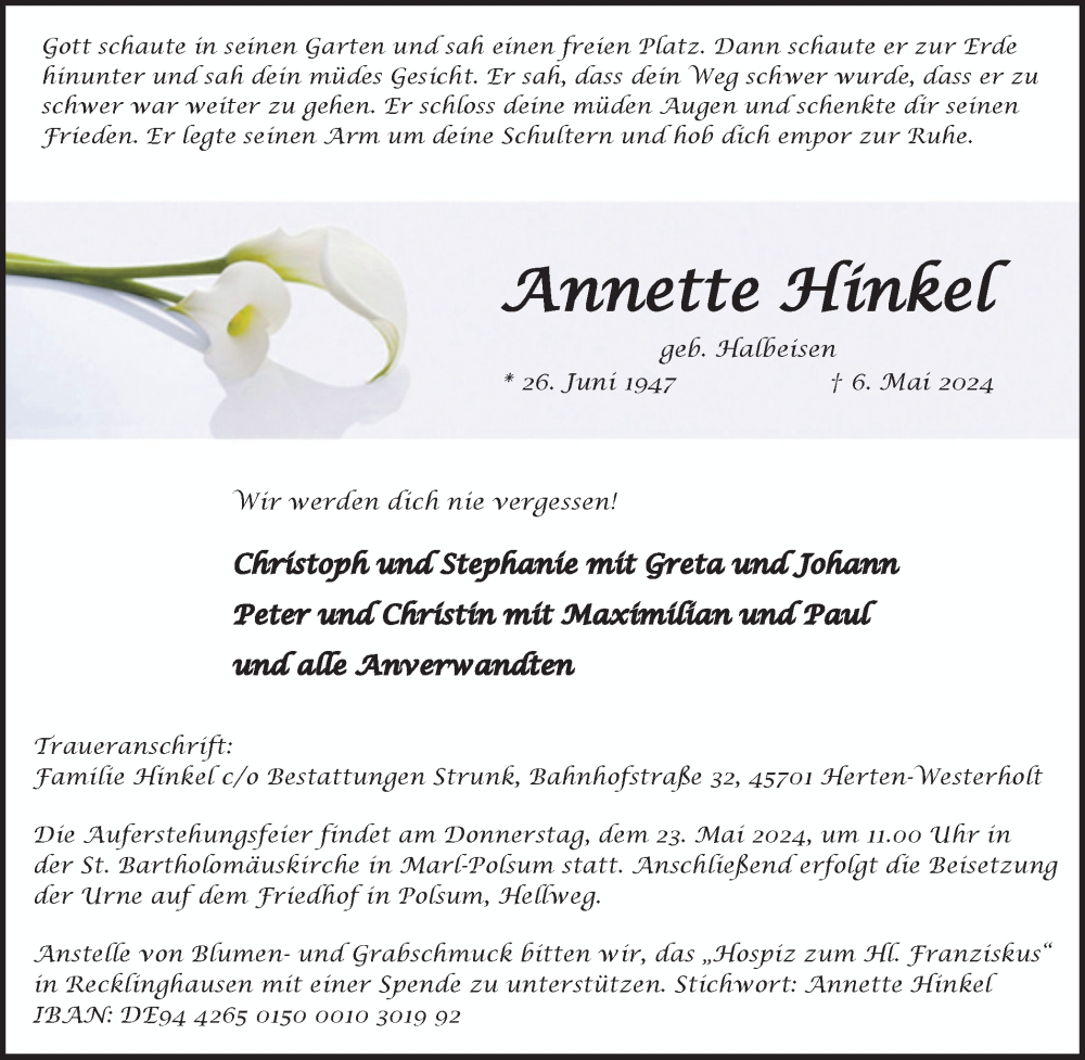 Hier finden Sie alle Traueranzeigen aus der Zeitung, die bisher für Annette Hinkel erschienen sind. Weitere Traueranzeigen, die in der Zeitung erscheinen, werden hier ebenfalls aufgelistet