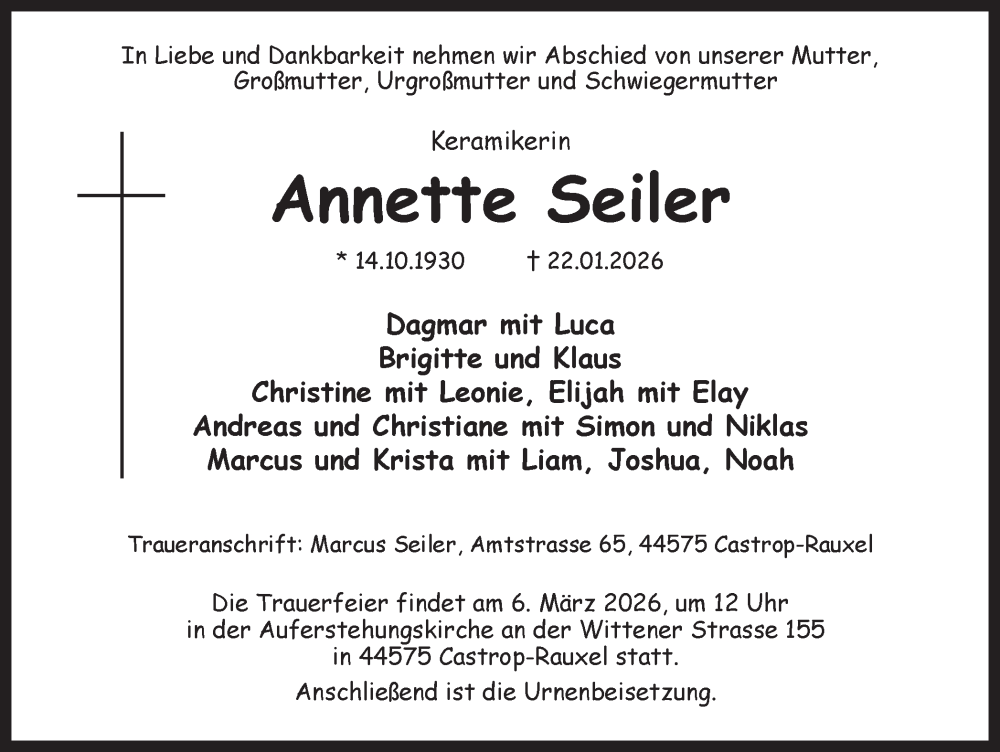 Hier finden Sie alle Traueranzeigen aus der Zeitung, die bisher für Annette Seiler erschienen sind. Weitere Traueranzeigen, die in der Zeitung erscheinen, werden hier ebenfalls aufgelistet