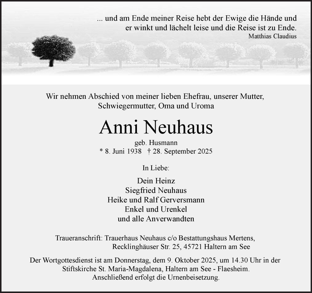 Hier finden Sie alle Traueranzeigen aus der Zeitung, die bisher für Anni Neuhaus erschienen sind. Weitere Traueranzeigen, die in der Zeitung erscheinen, werden hier ebenfalls aufgelistet