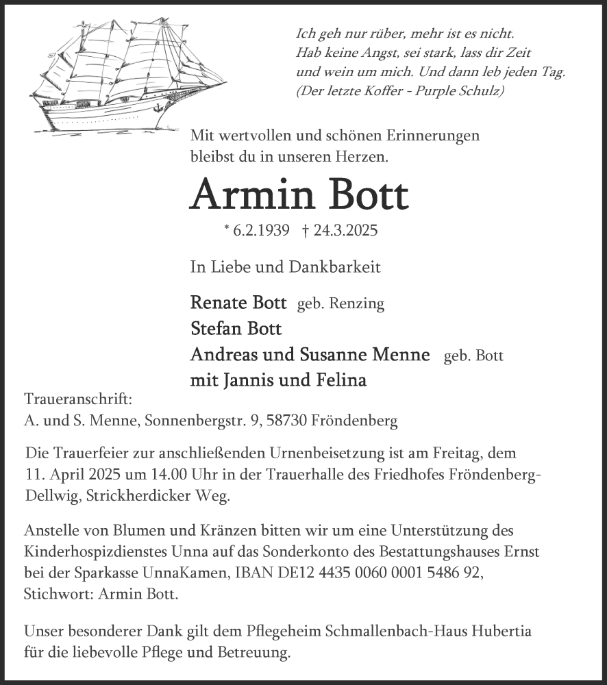 Hier finden Sie alle Traueranzeigen aus der Zeitung, die bisher für Armin Bott erschienen sind. Weitere Traueranzeigen, die in der Zeitung erscheinen, werden hier ebenfalls aufgelistet