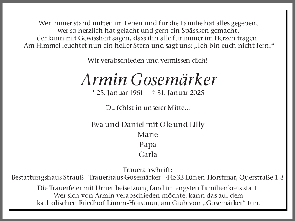 Hier finden Sie alle Traueranzeigen aus der Zeitung, die bisher für Armin Gosemärker erschienen sind. Weitere Traueranzeigen, die in der Zeitung erscheinen, werden hier ebenfalls aufgelistet
