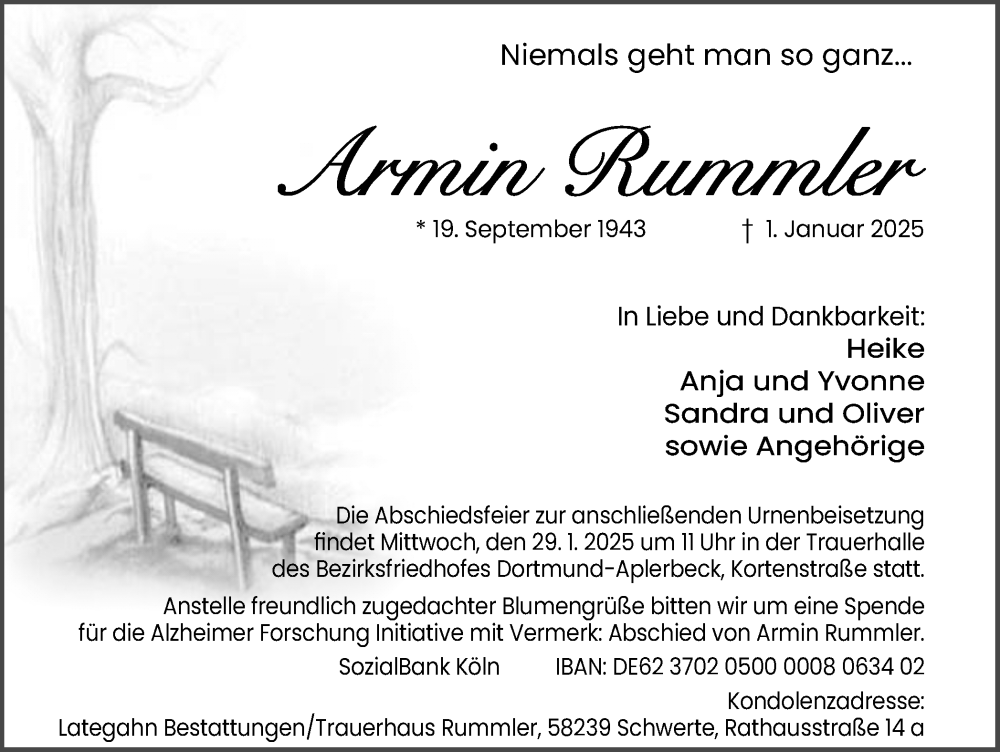 Hier finden Sie alle Traueranzeigen aus der Zeitung, die bisher für Armin Rummler erschienen sind. Weitere Traueranzeigen, die in der Zeitung erscheinen, werden hier ebenfalls aufgelistet
