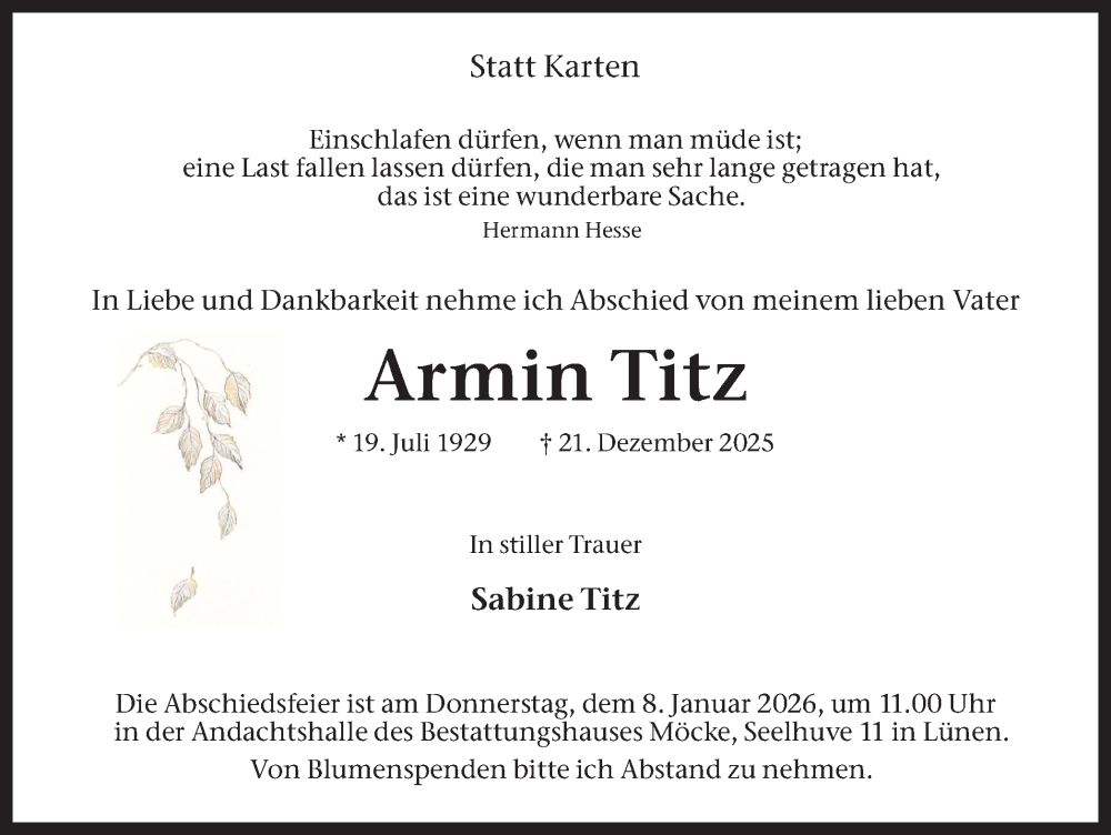 Hier finden Sie alle Traueranzeigen aus der Zeitung, die bisher für Armin Titz erschienen sind. Weitere Traueranzeigen, die in der Zeitung erscheinen, werden hier ebenfalls aufgelistet