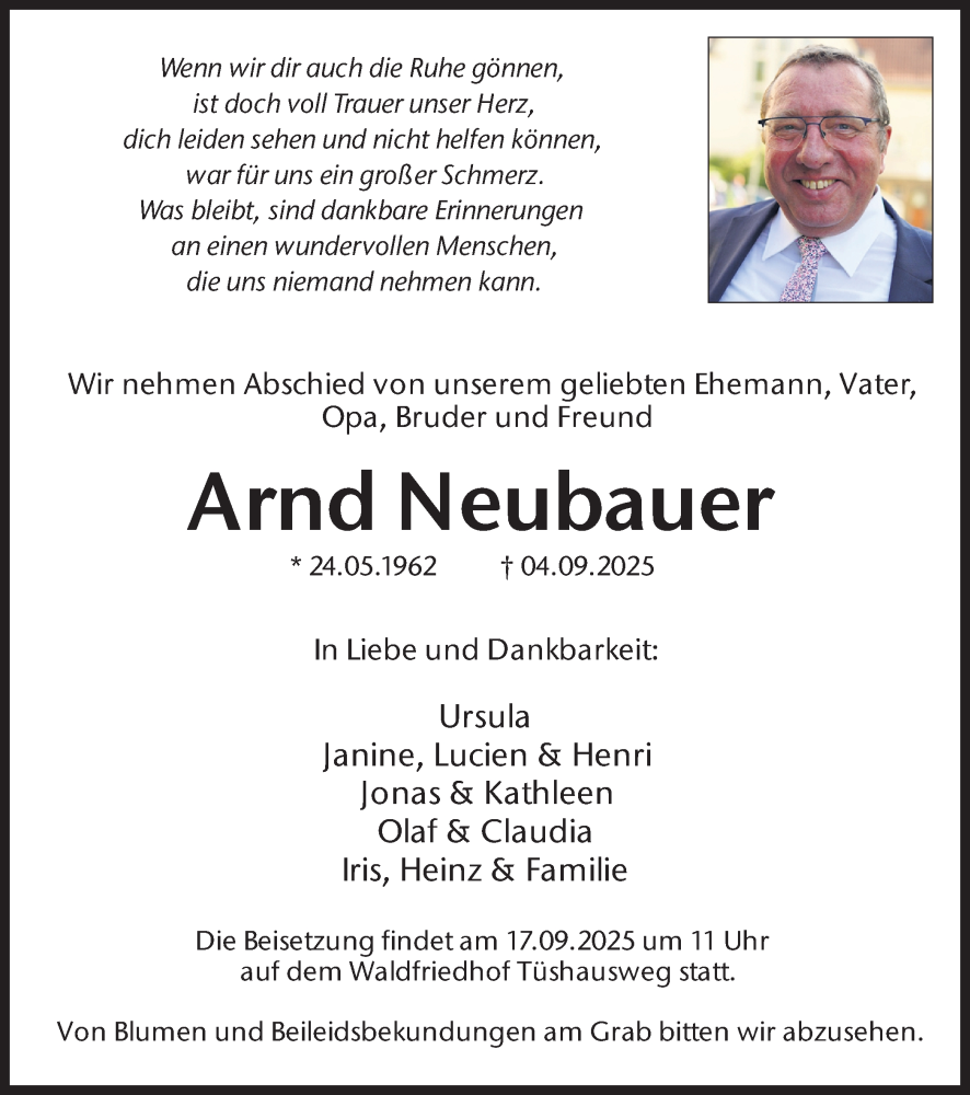 Hier finden Sie alle Traueranzeigen aus der Zeitung, die bisher für Arnd Neubauer erschienen sind. Weitere Traueranzeigen, die in der Zeitung erscheinen, werden hier ebenfalls aufgelistet