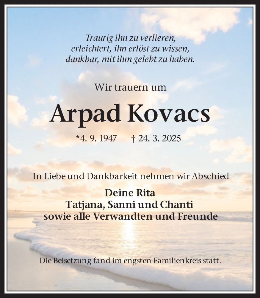 Hier finden Sie alle Traueranzeigen aus der Zeitung, die bisher für Arpad Kovacs erschienen sind. Weitere Traueranzeigen, die in der Zeitung erscheinen, werden hier ebenfalls aufgelistet