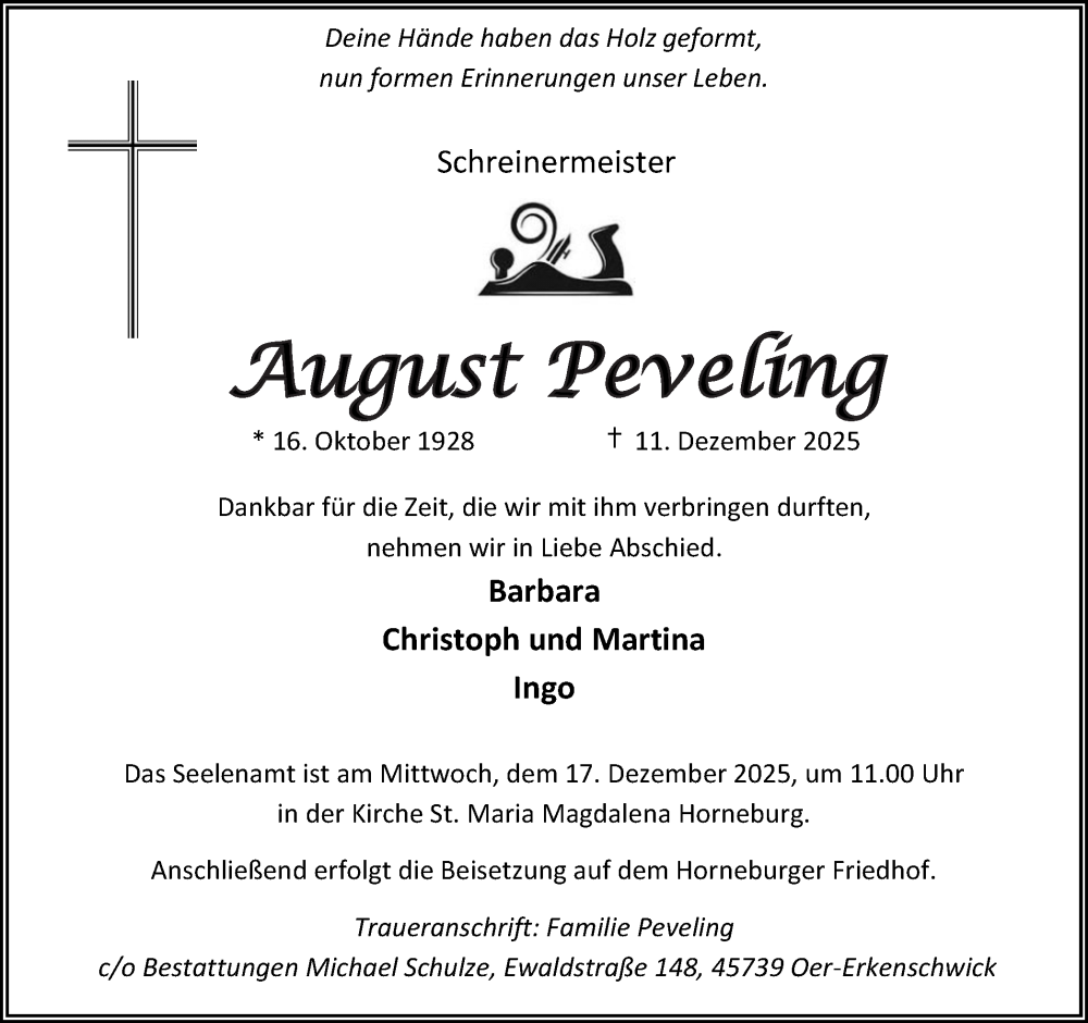 Hier finden Sie alle Traueranzeigen aus der Zeitung, die bisher für August Peveling erschienen sind. Weitere Traueranzeigen, die in der Zeitung erscheinen, werden hier ebenfalls aufgelistet