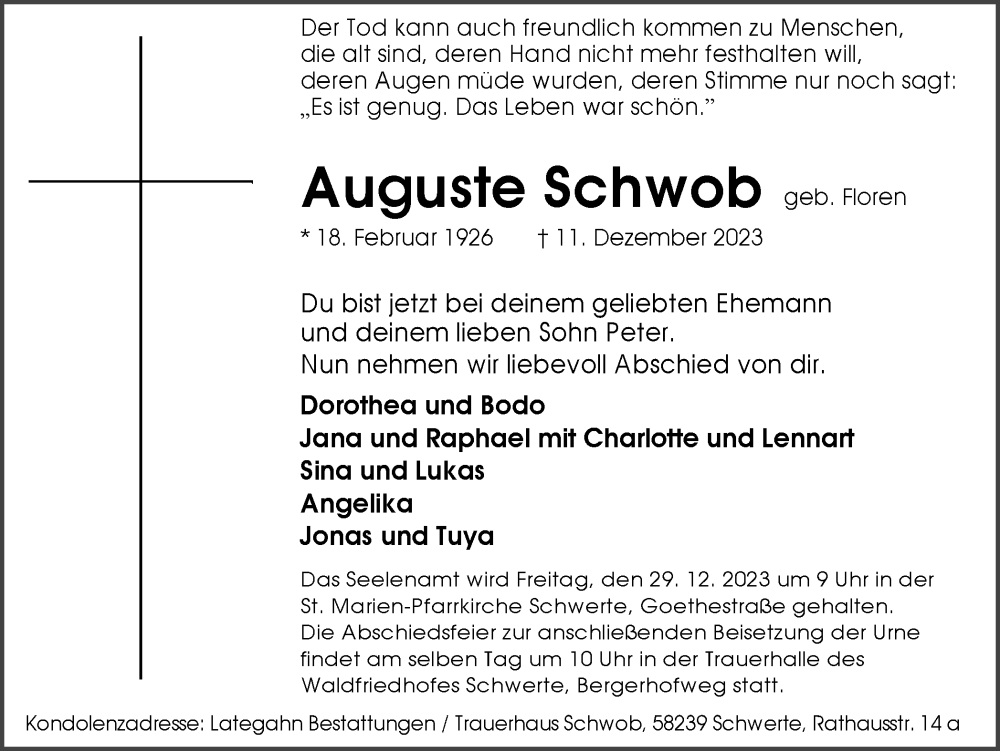 Hier finden Sie alle Traueranzeigen aus der Zeitung, die bisher für Auguste Schwob erschienen sind. Weitere Traueranzeigen, die in der Zeitung erscheinen, werden hier ebenfalls aufgelistet