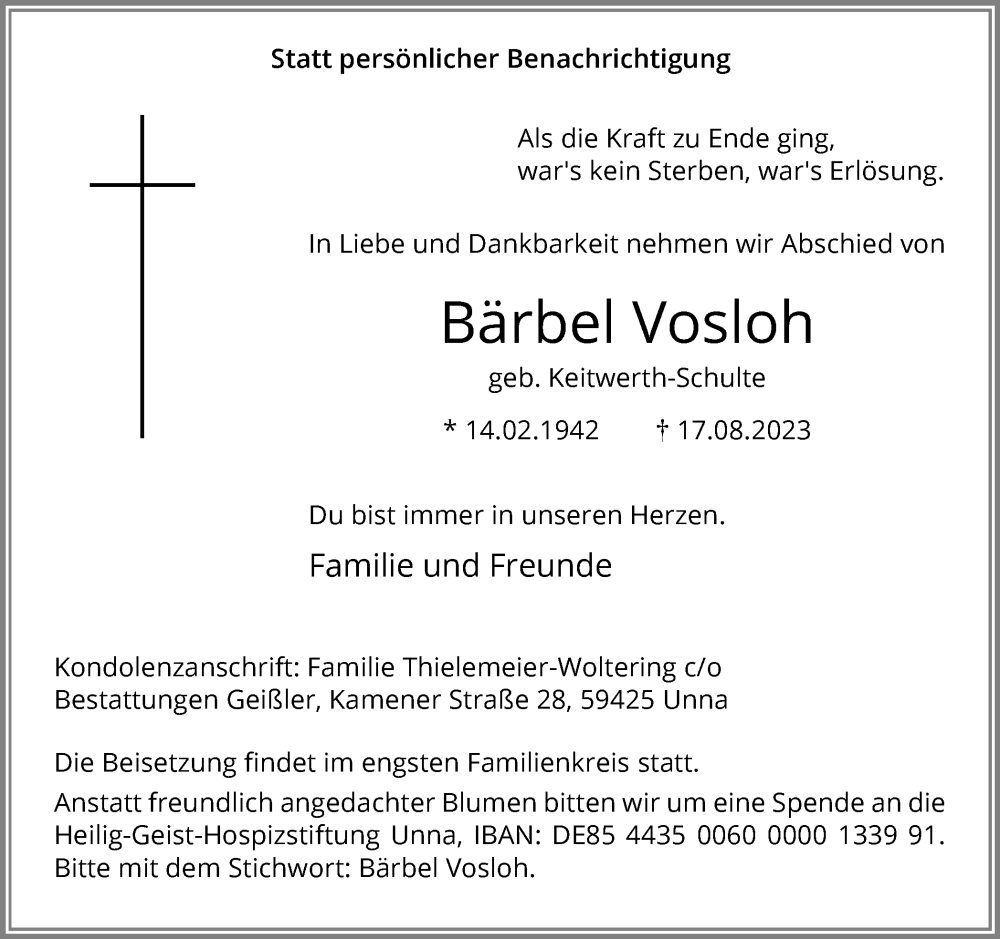 Hier finden Sie alle Traueranzeigen aus der Zeitung, die bisher für Bärbel Vosloh erschienen sind. Weitere Traueranzeigen, die in der Zeitung erscheinen, werden hier ebenfalls aufgelistet