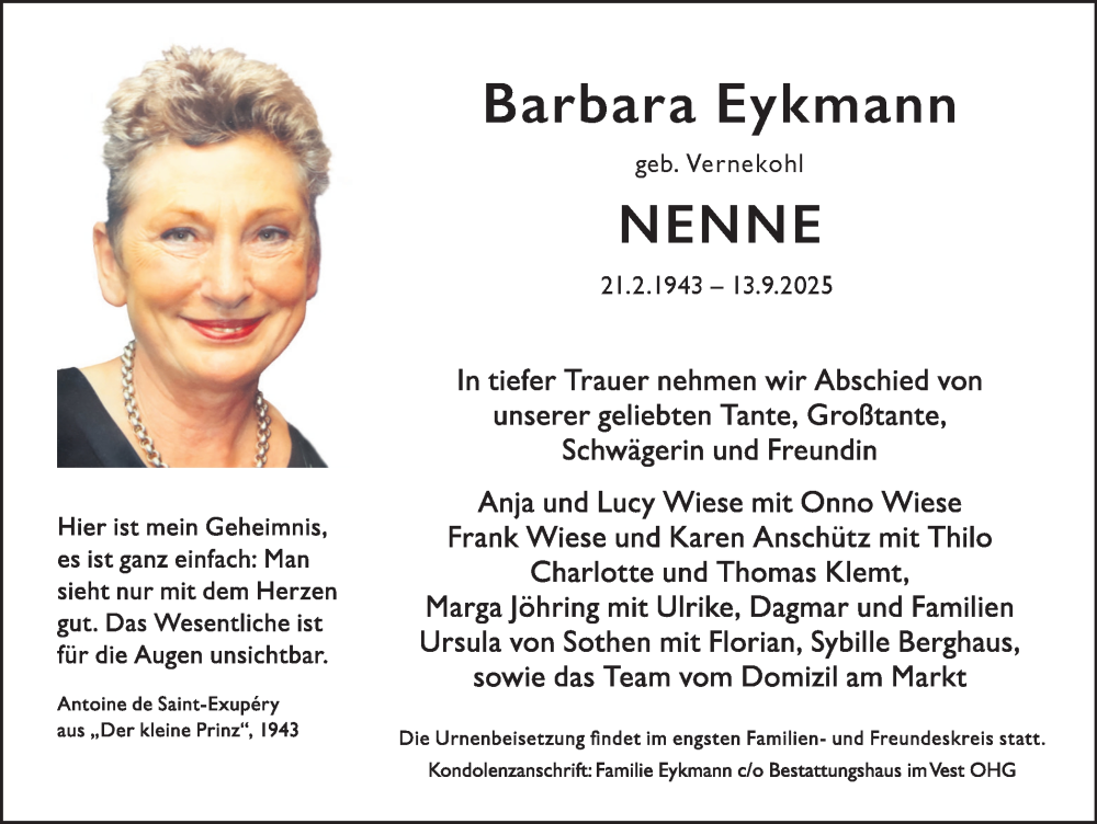 Hier finden Sie alle Traueranzeigen aus der Zeitung, die bisher für Barbara Eykmann erschienen sind. Weitere Traueranzeigen, die in der Zeitung erscheinen, werden hier ebenfalls aufgelistet