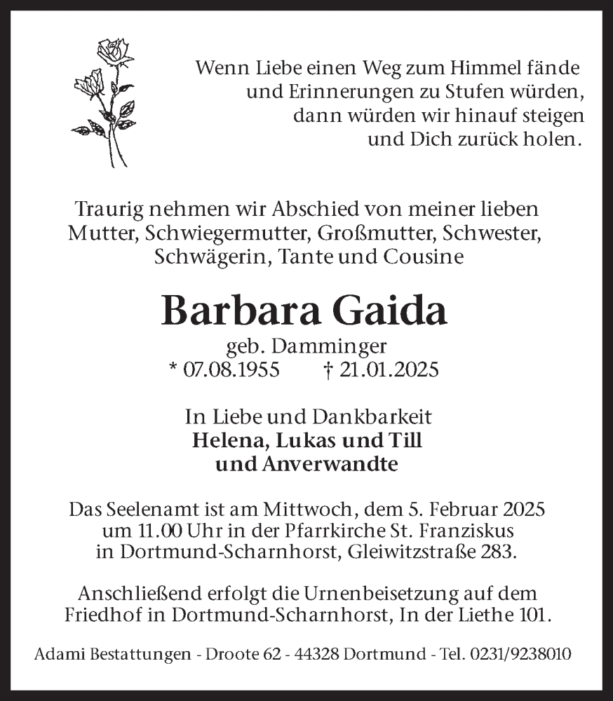 Hier finden Sie alle Traueranzeigen aus der Zeitung, die bisher für Barbara Gaida erschienen sind. Weitere Traueranzeigen, die in der Zeitung erscheinen, werden hier ebenfalls aufgelistet