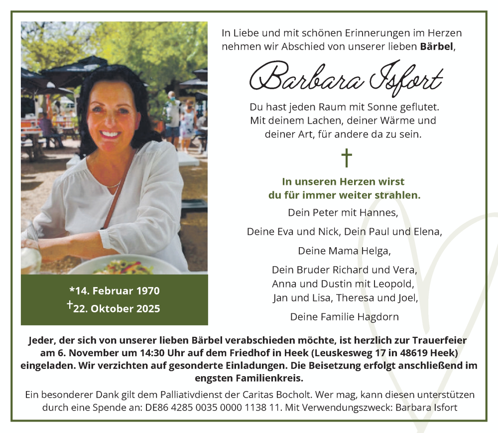 Hier finden Sie alle Traueranzeigen aus der Zeitung, die bisher für Barbara Isfort erschienen sind. Weitere Traueranzeigen, die in der Zeitung erscheinen, werden hier ebenfalls aufgelistet