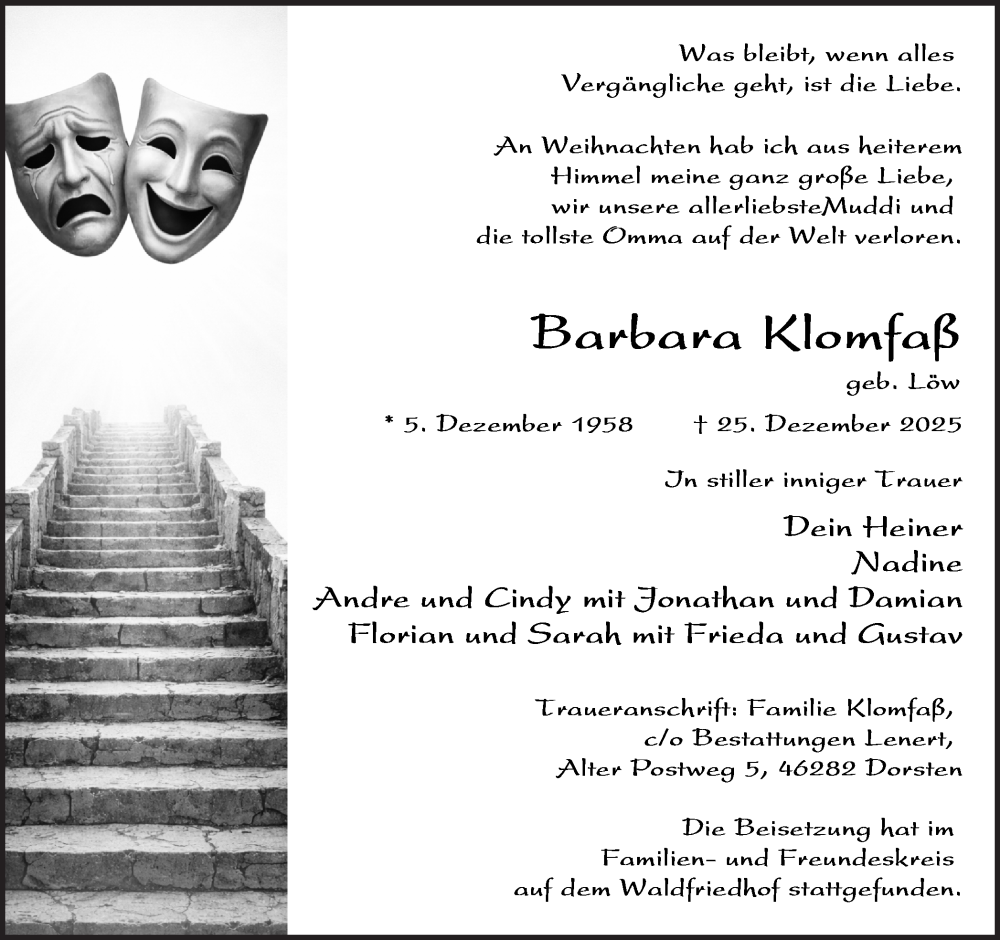Hier finden Sie alle Traueranzeigen aus der Zeitung, die bisher für Barbara Klomfaß erschienen sind. Weitere Traueranzeigen, die in der Zeitung erscheinen, werden hier ebenfalls aufgelistet