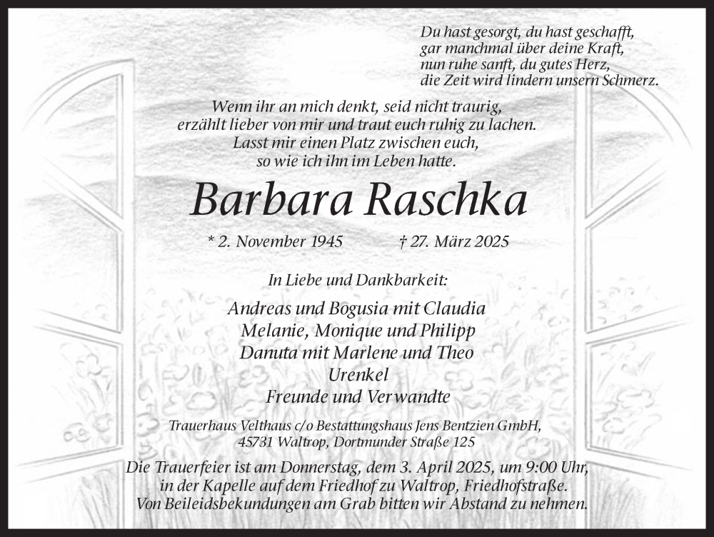 Hier finden Sie alle Traueranzeigen aus der Zeitung, die bisher für Barbara Raschka erschienen sind. Weitere Traueranzeigen, die in der Zeitung erscheinen, werden hier ebenfalls aufgelistet