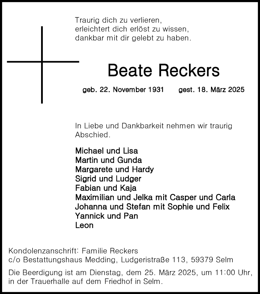 Hier finden Sie alle Traueranzeigen aus der Zeitung, die bisher für Beate Reckers erschienen sind. Weitere Traueranzeigen, die in der Zeitung erscheinen, werden hier ebenfalls aufgelistet